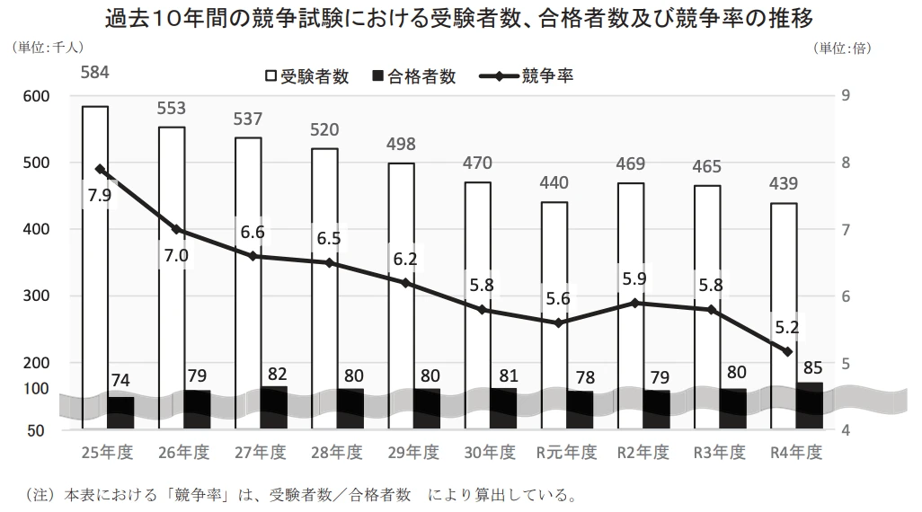 地方公務員採用における受験者数の減少だけでなく、辞退者の増加などにより、実質的な採用倍率は低下傾向にあります。総務省のデータを参照しても、人材獲得競争は年々激化しており、以前のような基準で「質の高い人材」を確保し続けることは困難な状況です。